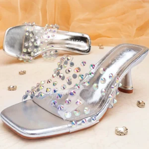 Transparent Square Toe Crystal Detailed Spool Heel | Silver