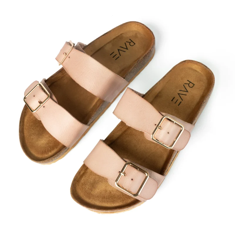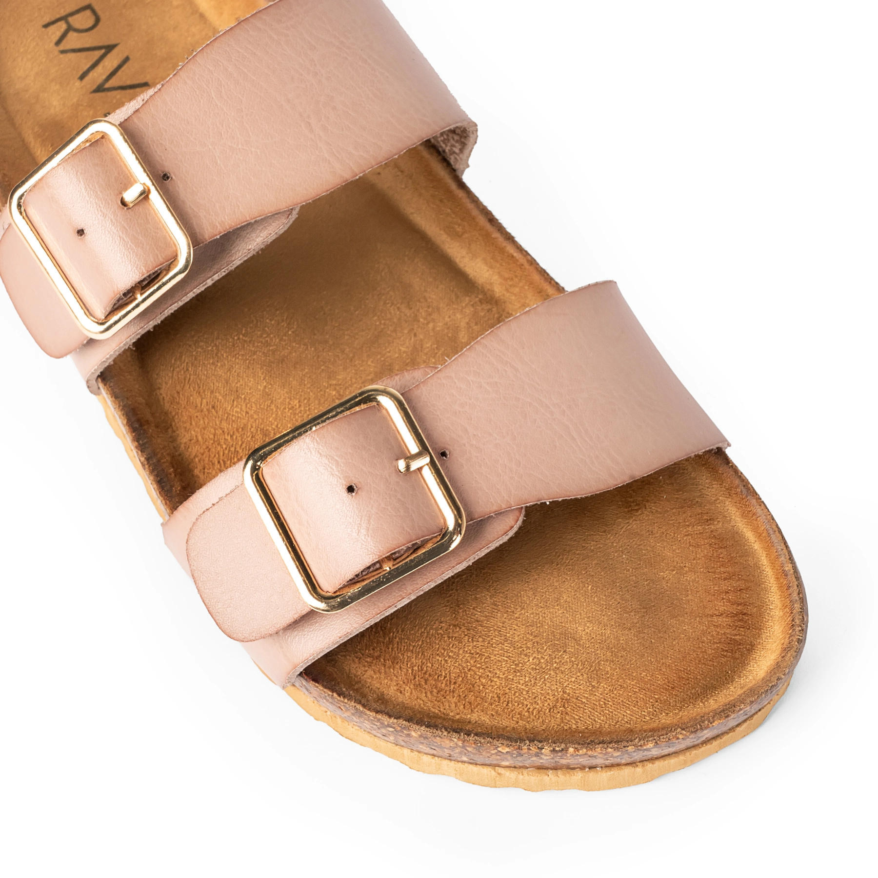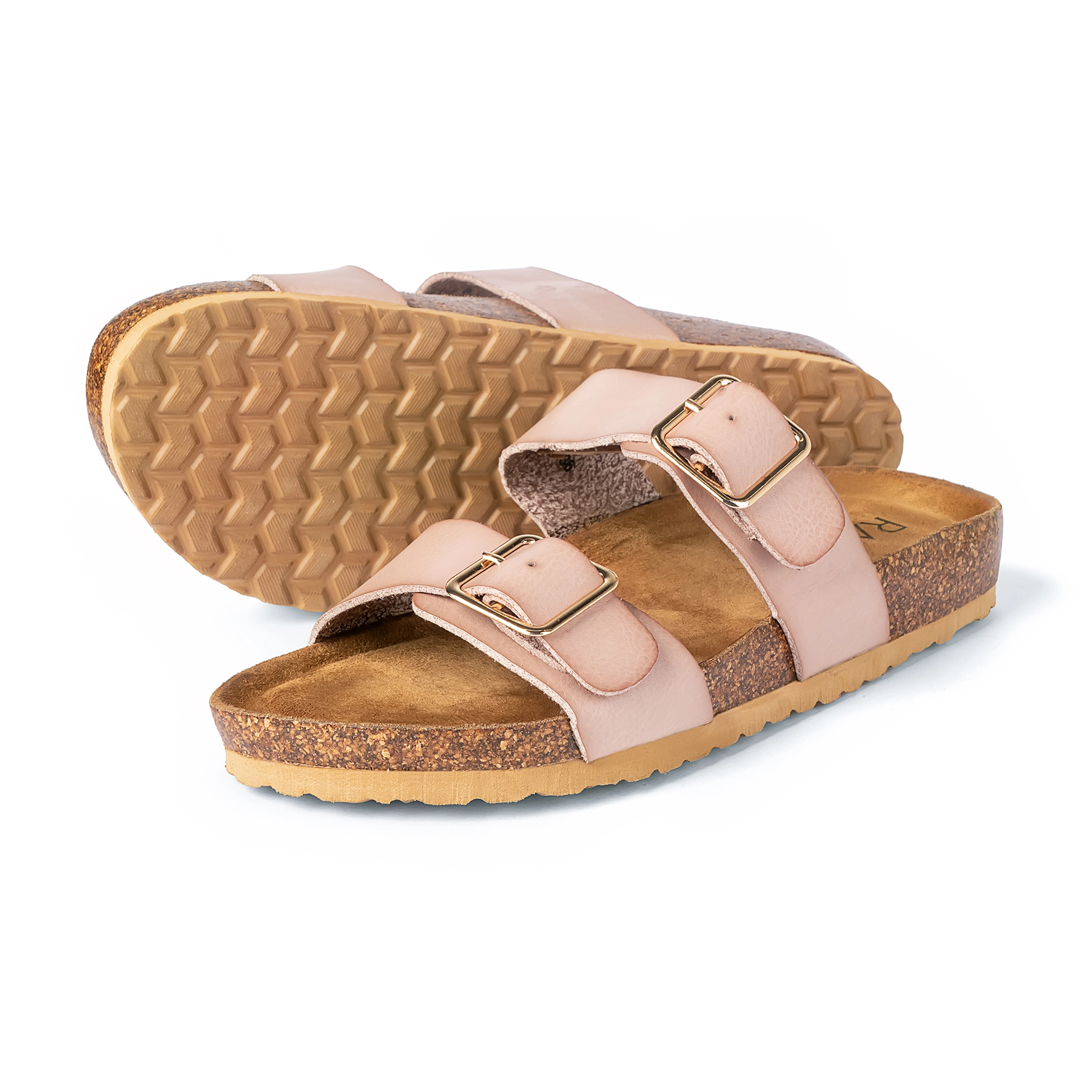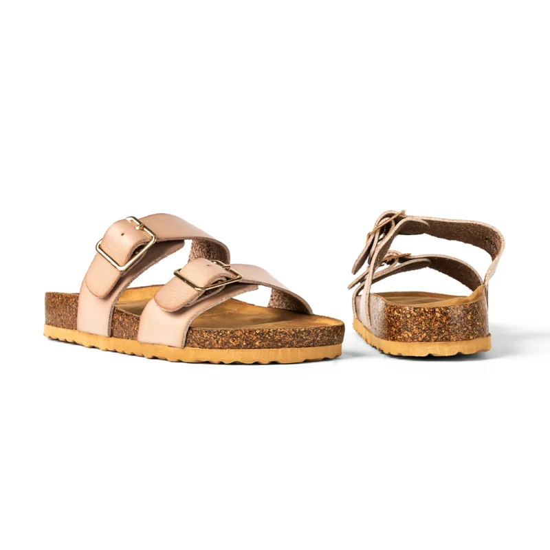 Casual chunky sandal with two wide adjustable straps with metal buckle detail, suede cushioned footbed, and a cork-textured midsole.