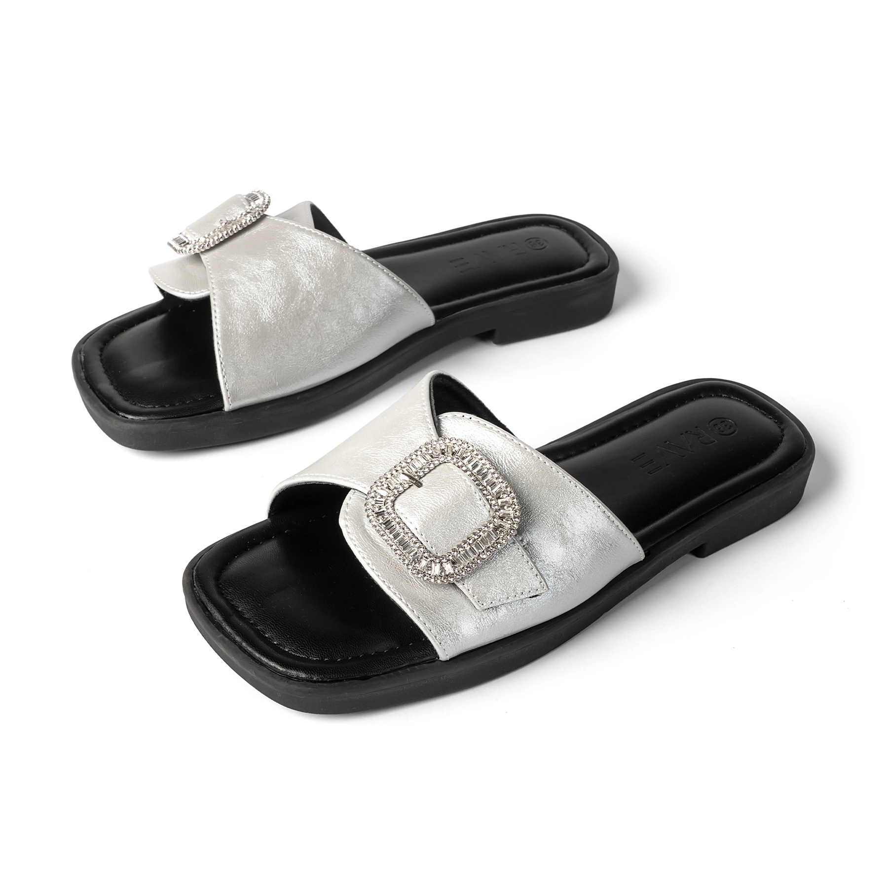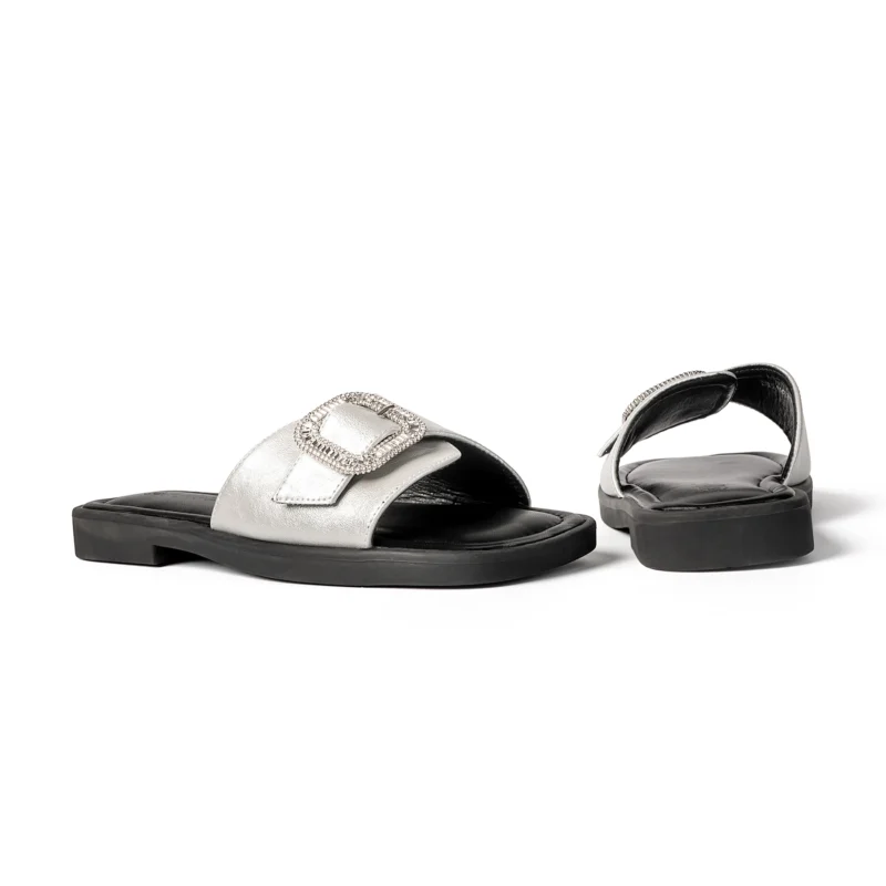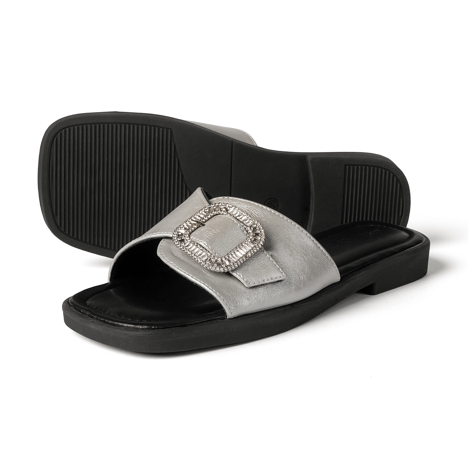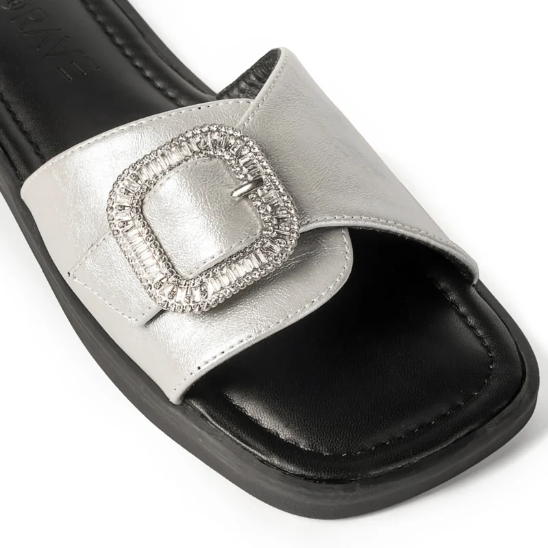 Upper Material –Faux leather with shimmery silver finish and crystal studded buckle.