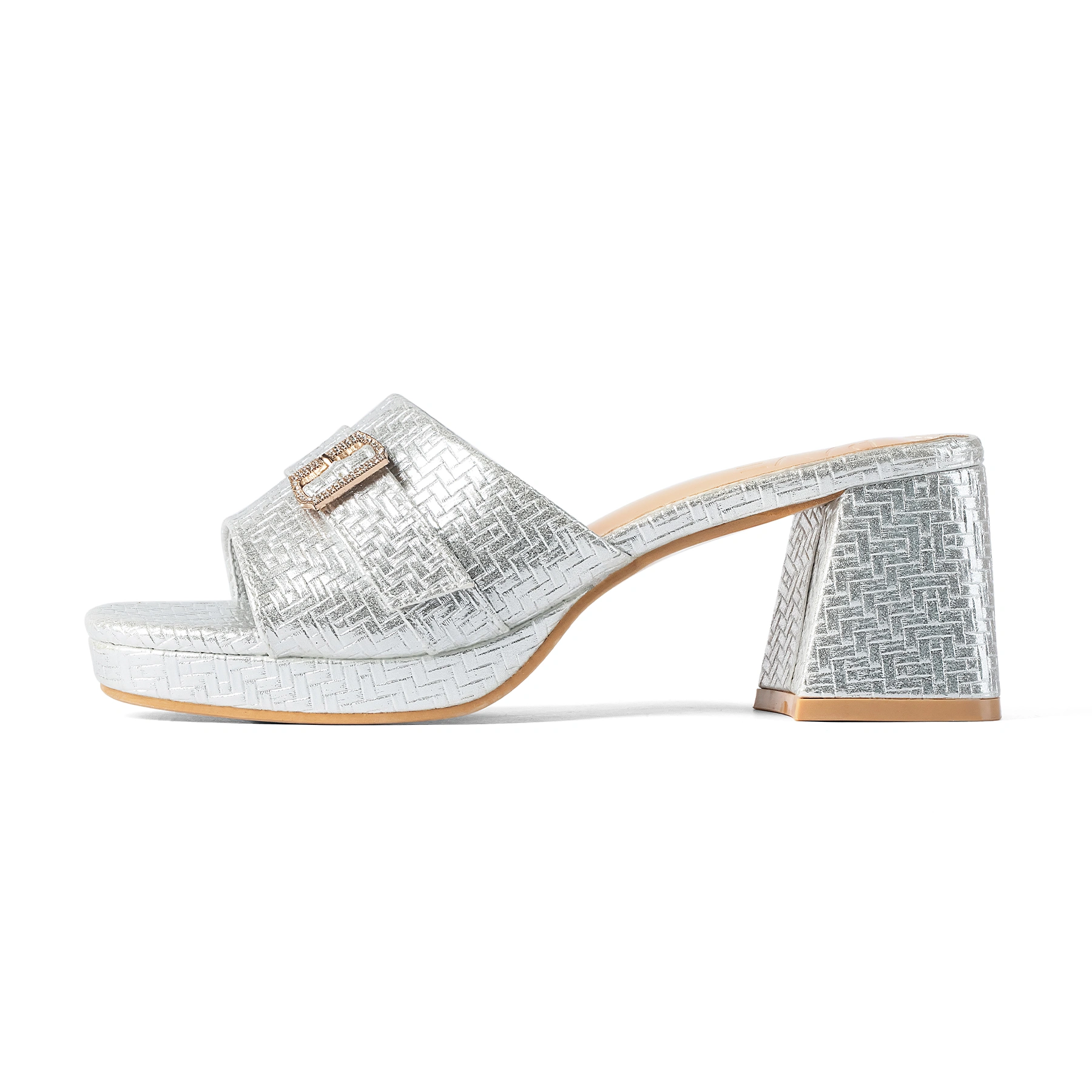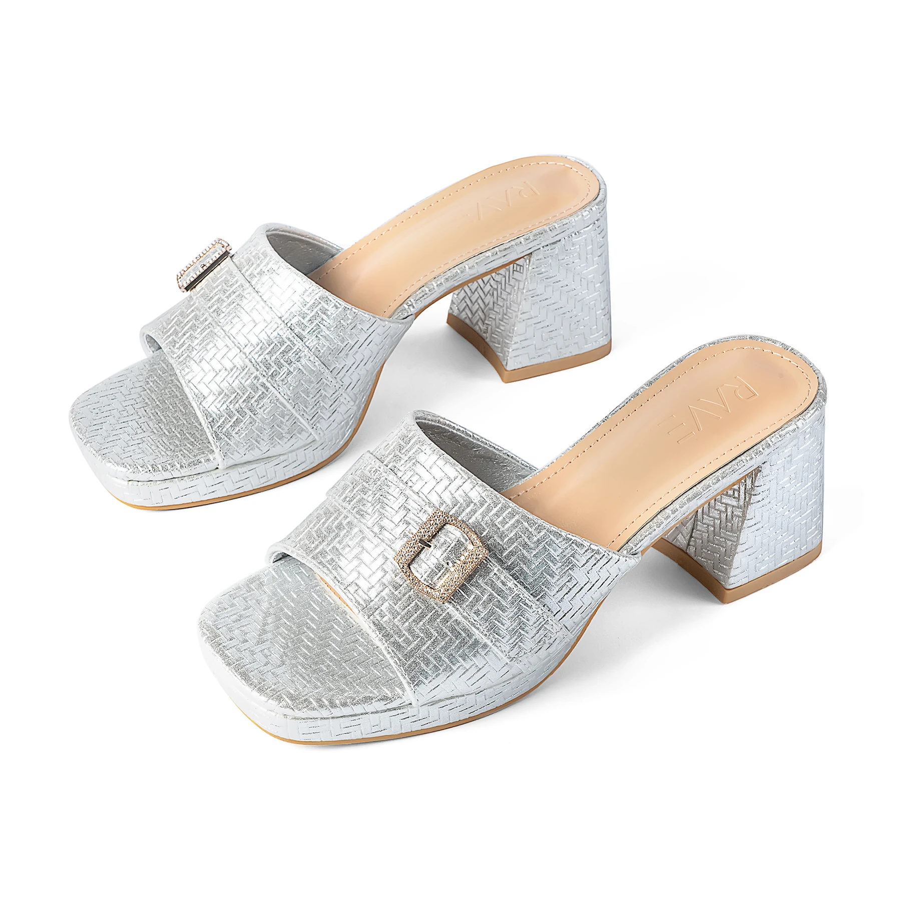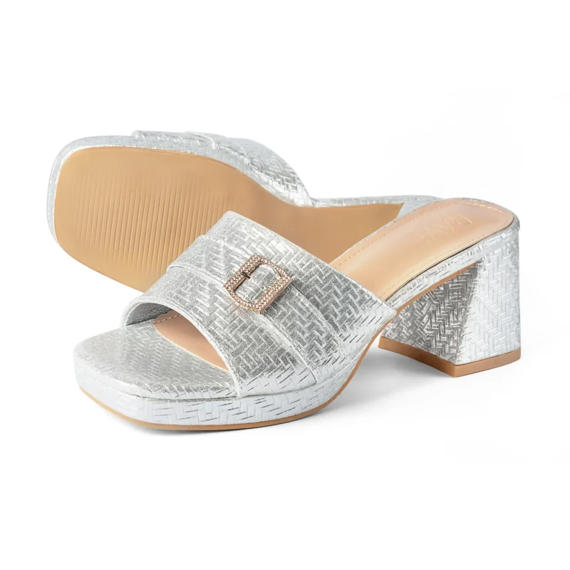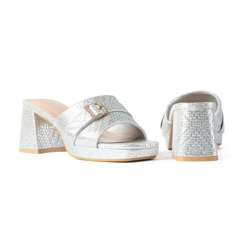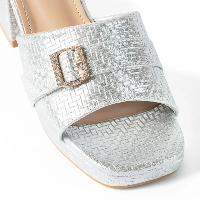 Square toe platform chunky block heel with shimmery textured body and buckle detail.