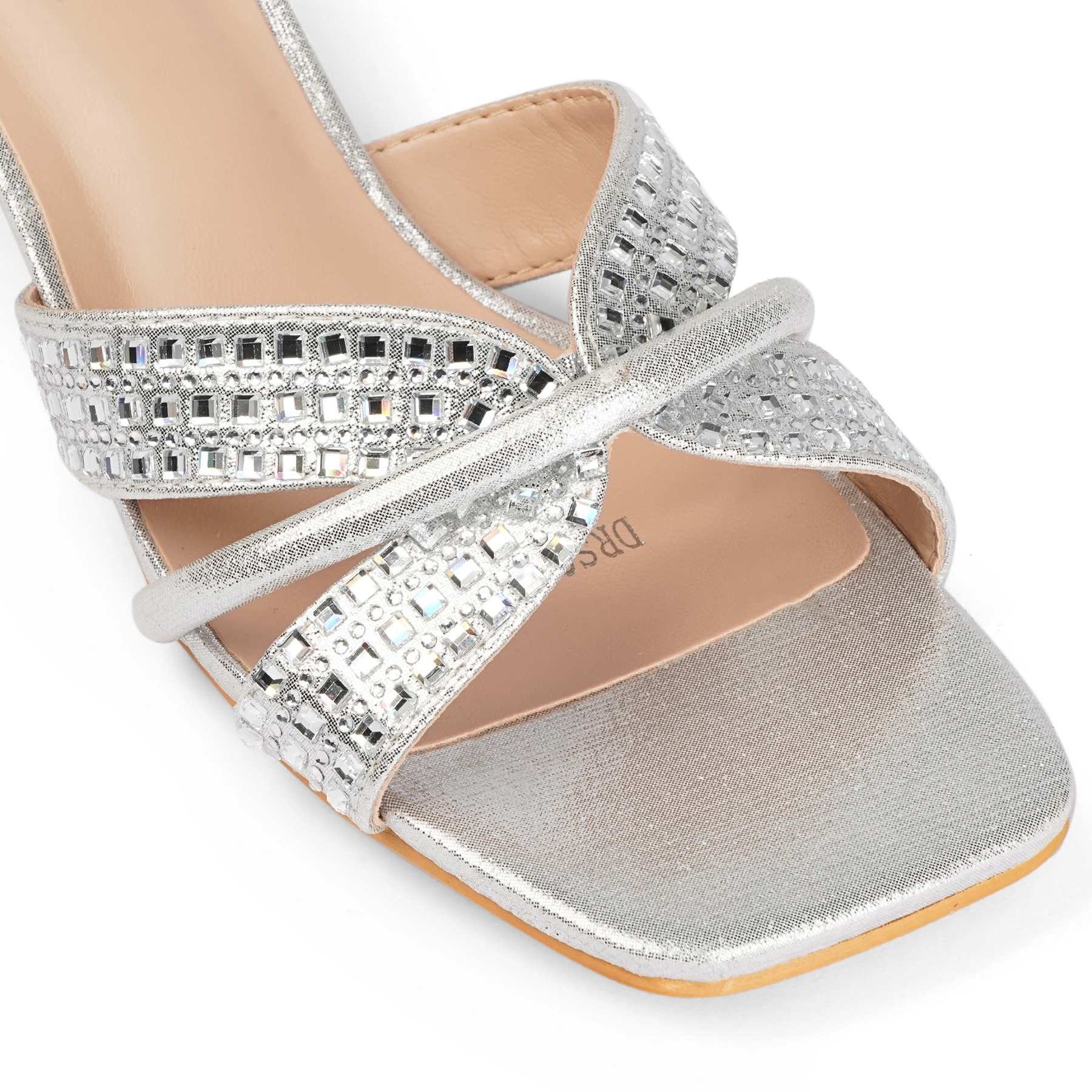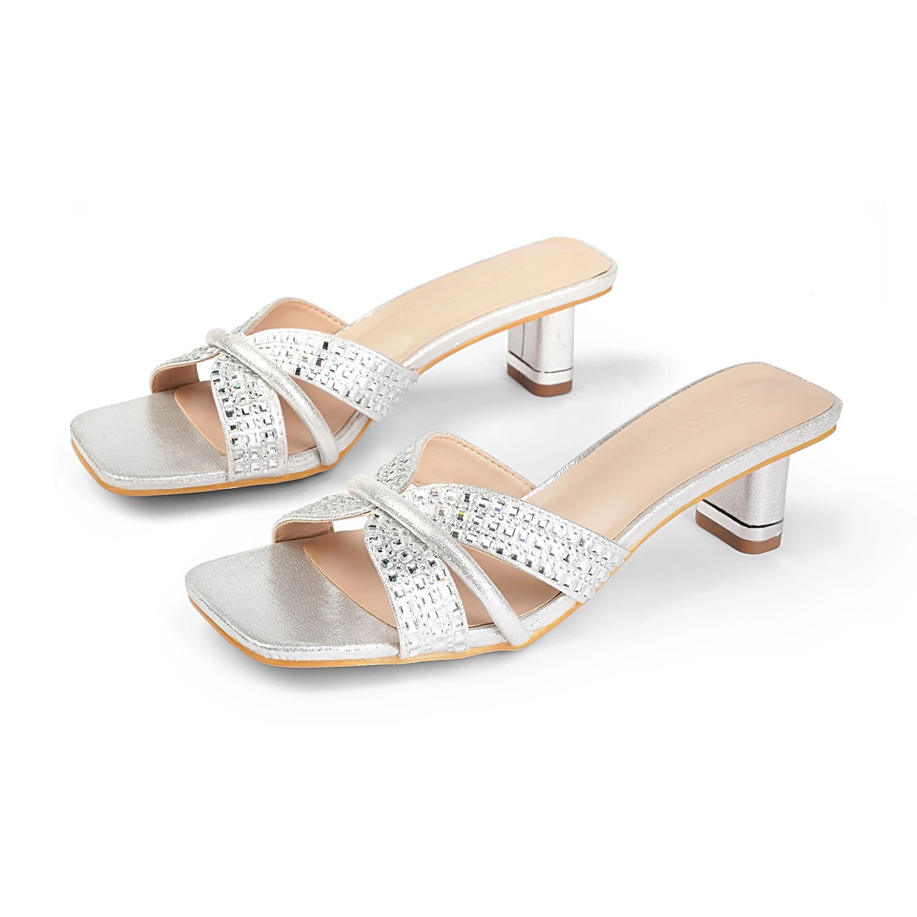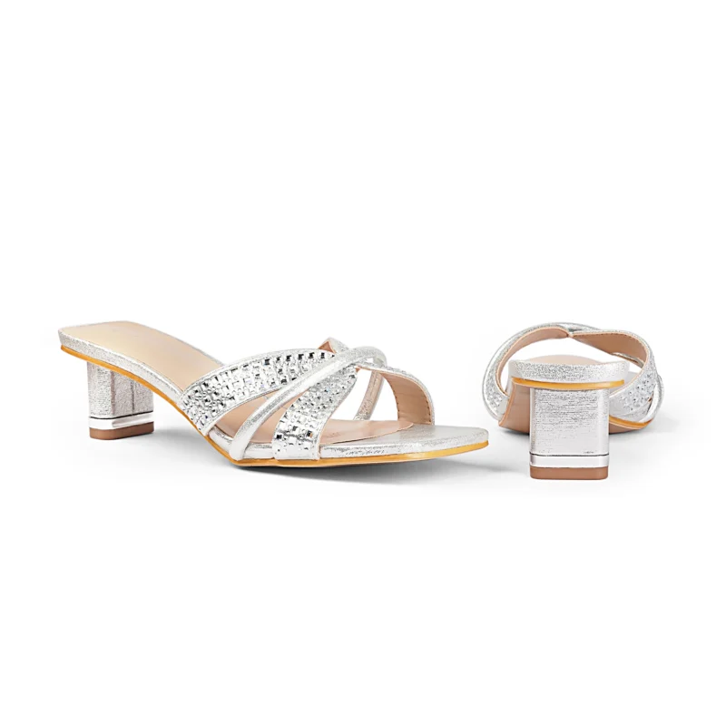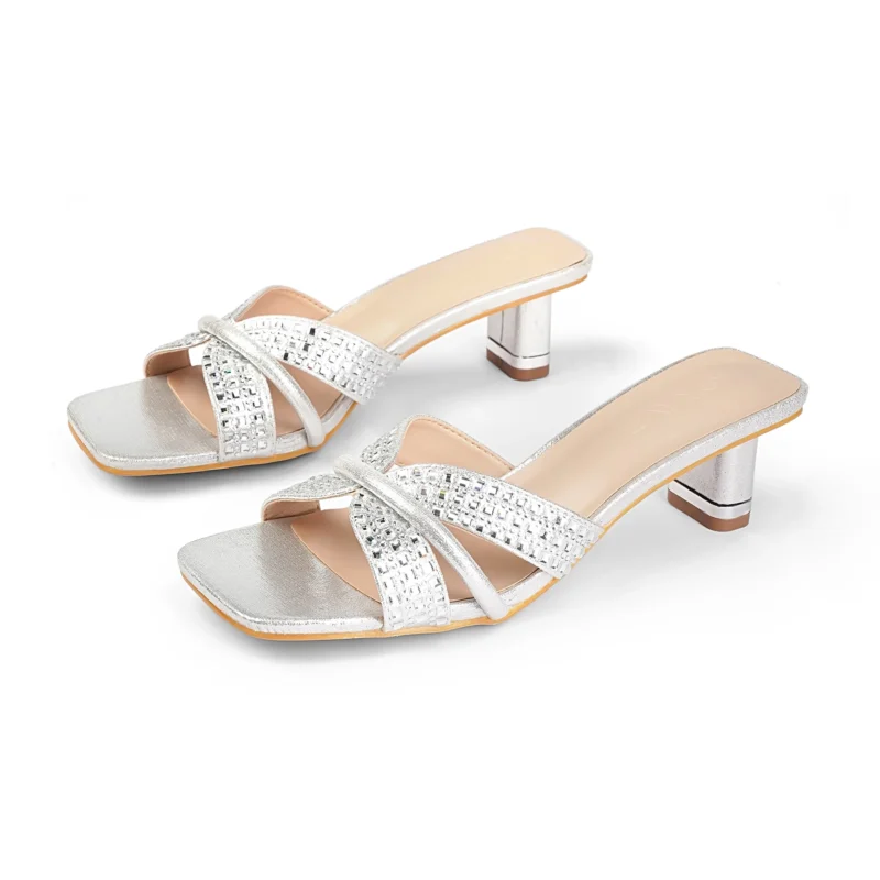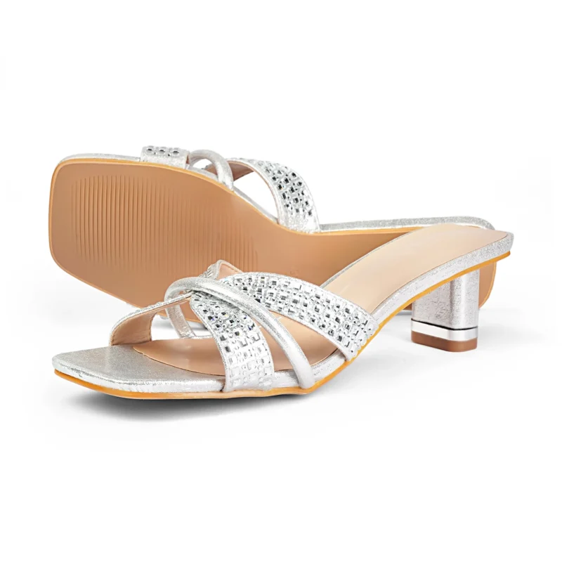 Square Toe Crystal Detailed Spool Heel | Silver Tk. 2,900