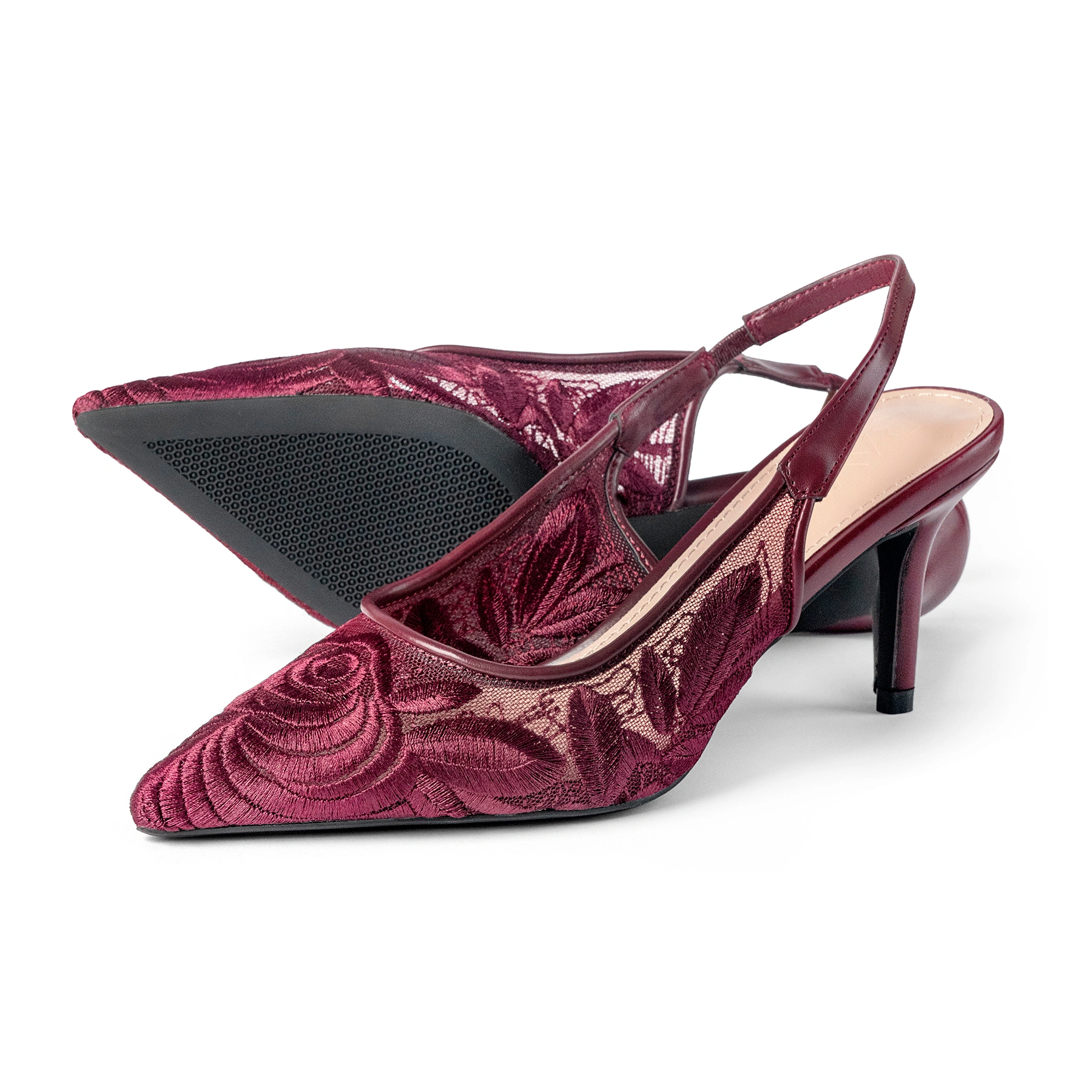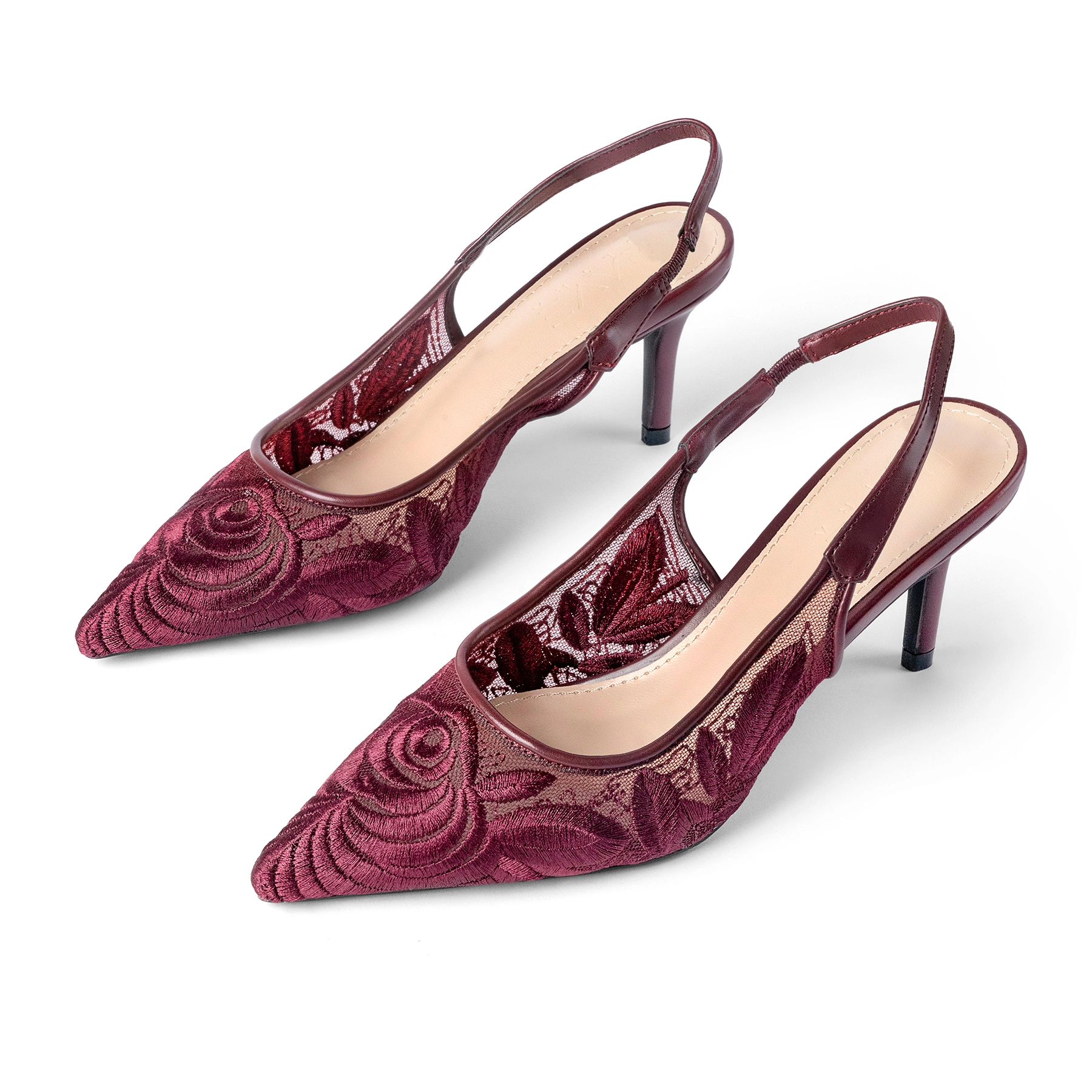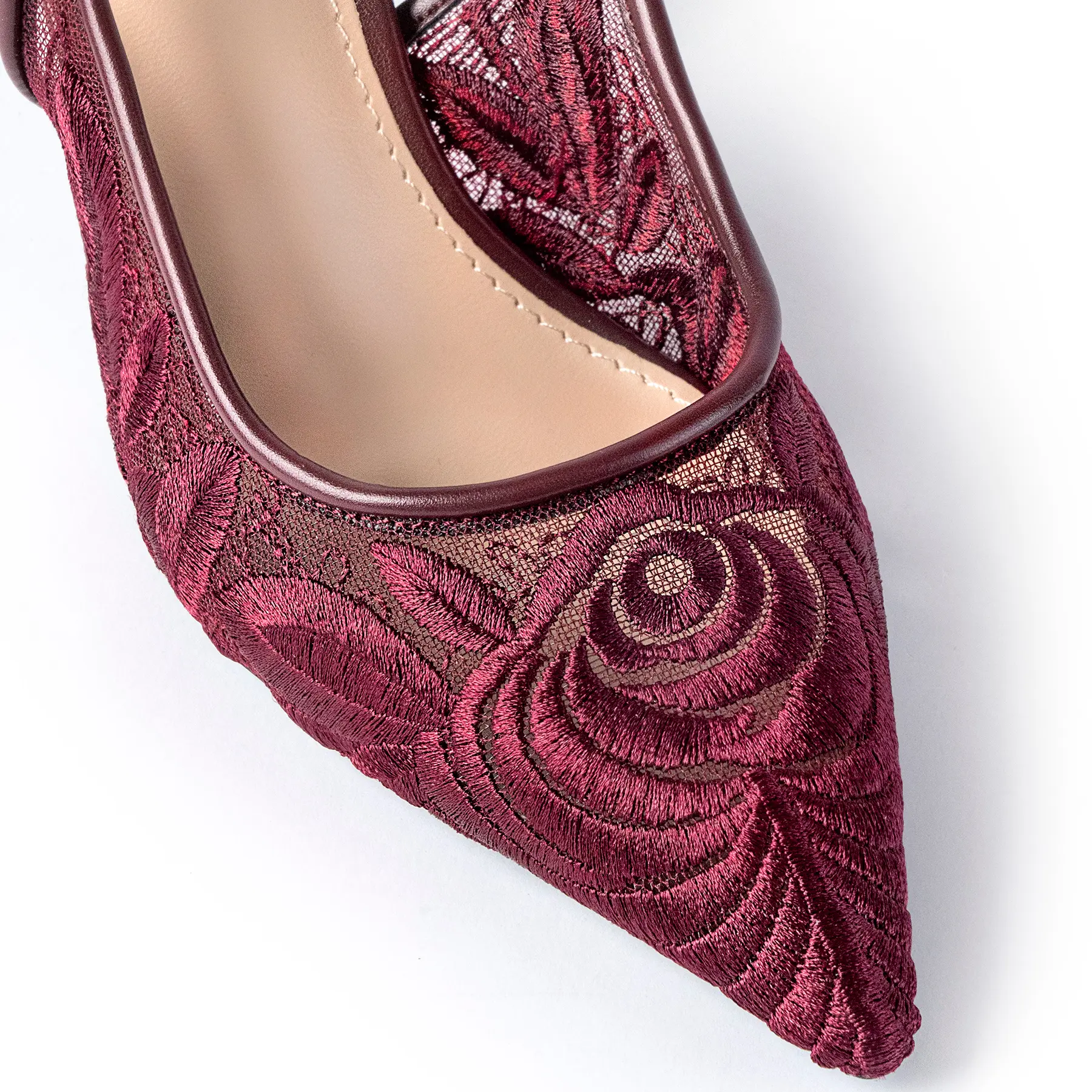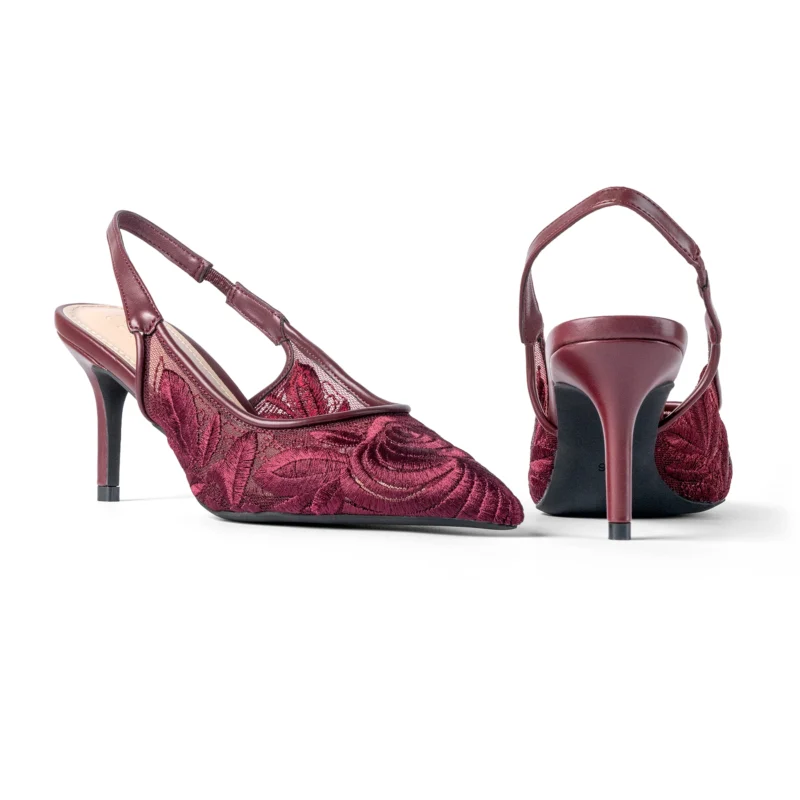 Pointed Toe Floral Embroidered Slingback Heel | Burgundy